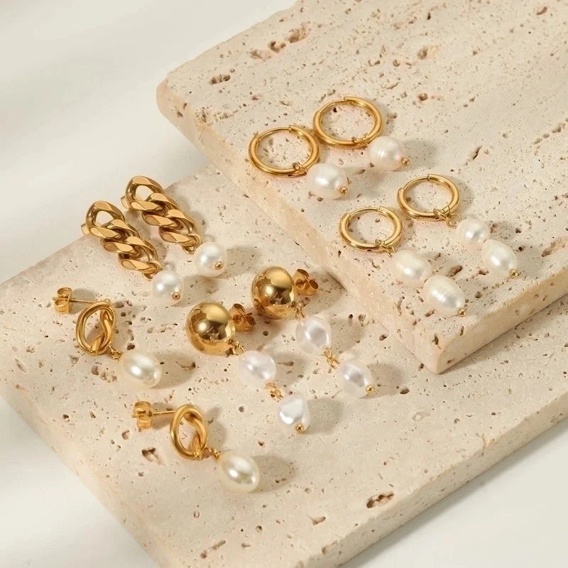 1 Pair Minimalist Round Patchwork 304 Stainless Steel Artificial Pearls Freshwater Pearl 18K Gold Plated Drop Earrings