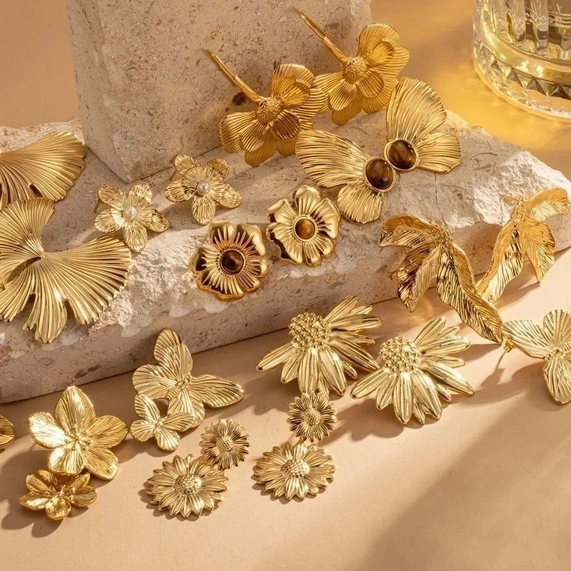 1 Pair Retro Geometric Flower Butterfly Plating Inlay Titanium Steel Tiger Eye 18K Gold Plated Ear Studs