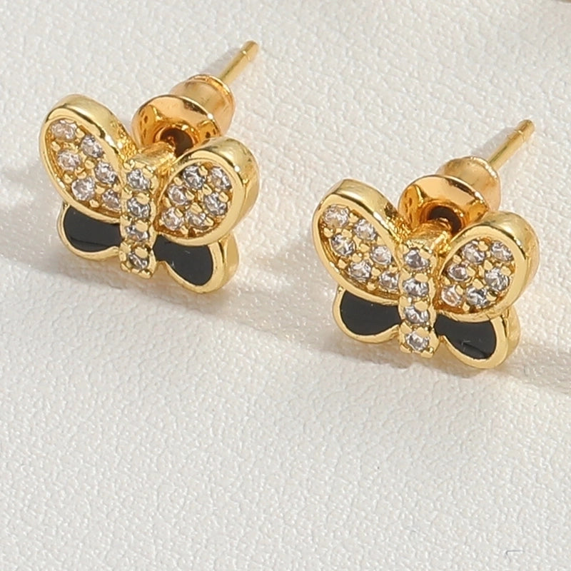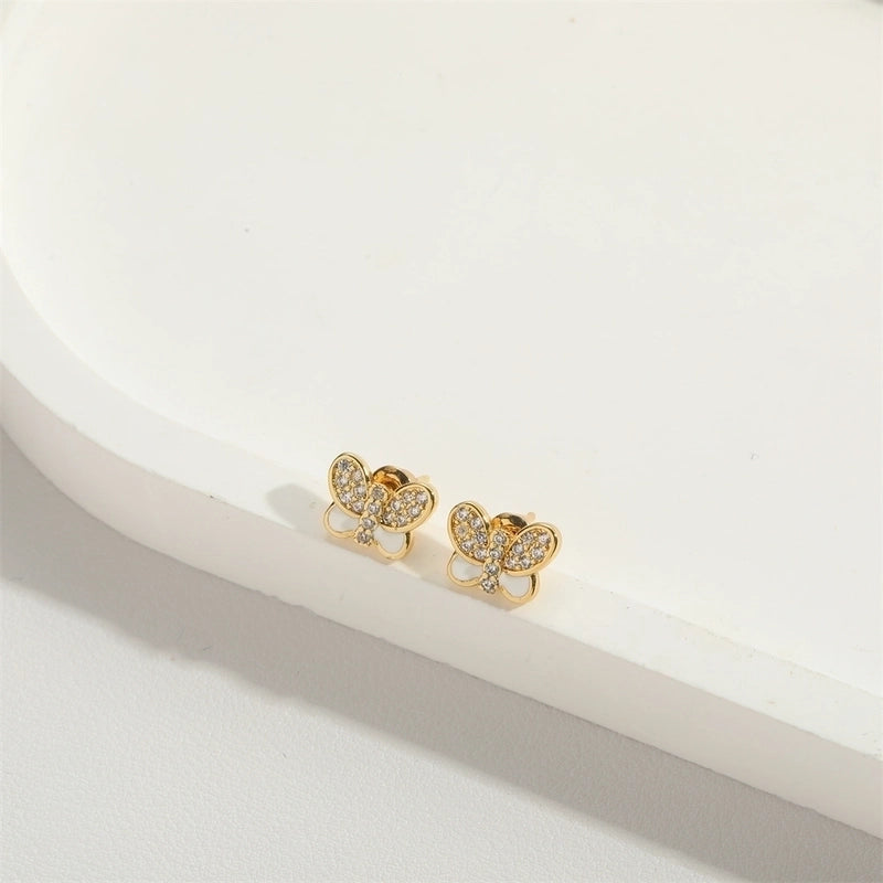 1 Pair Vintage Style Minimalist Commute Butterfly Enamel Inlay Copper Zircon 14K Gold Plated Ear Studs