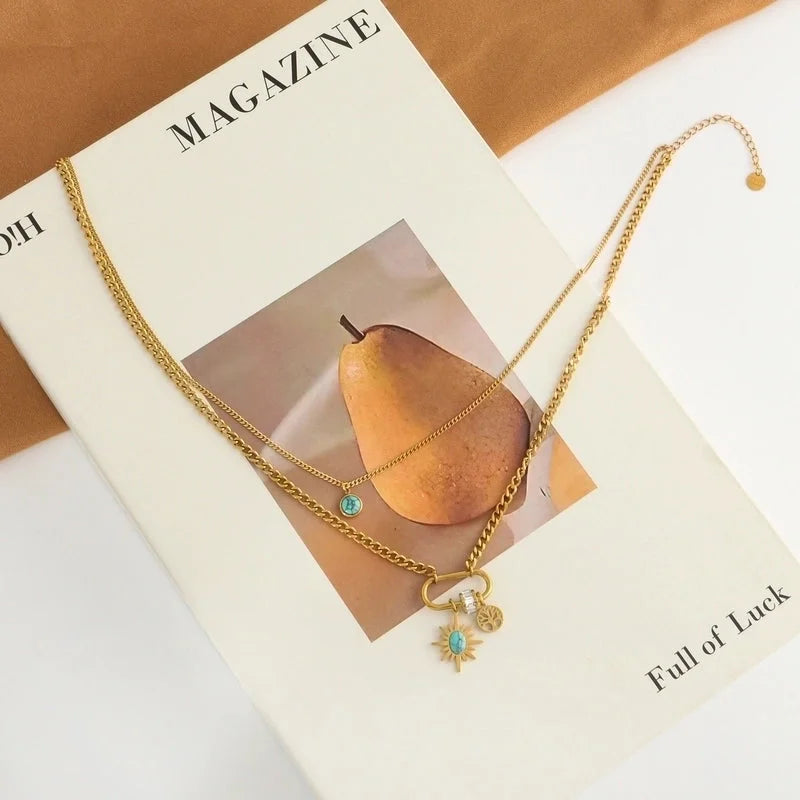 304 Stainless Steel 18K Gold Plated Elegant Lady Streetwear Plating Inlay Sun Turquoise Zircon Double Layer Necklaces Pendant Necklace