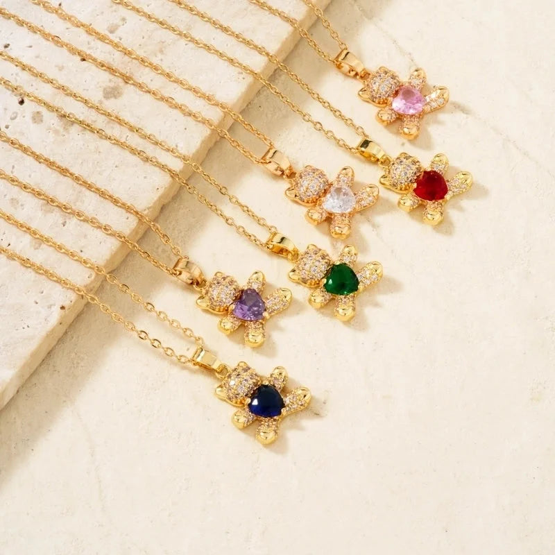 304 Stainless Steel Copper Rhodium Plated Inlay Bear Heart Shape Glass Zircon Pendant Necklace