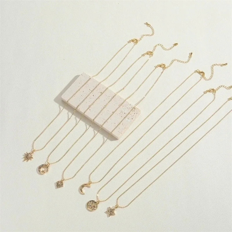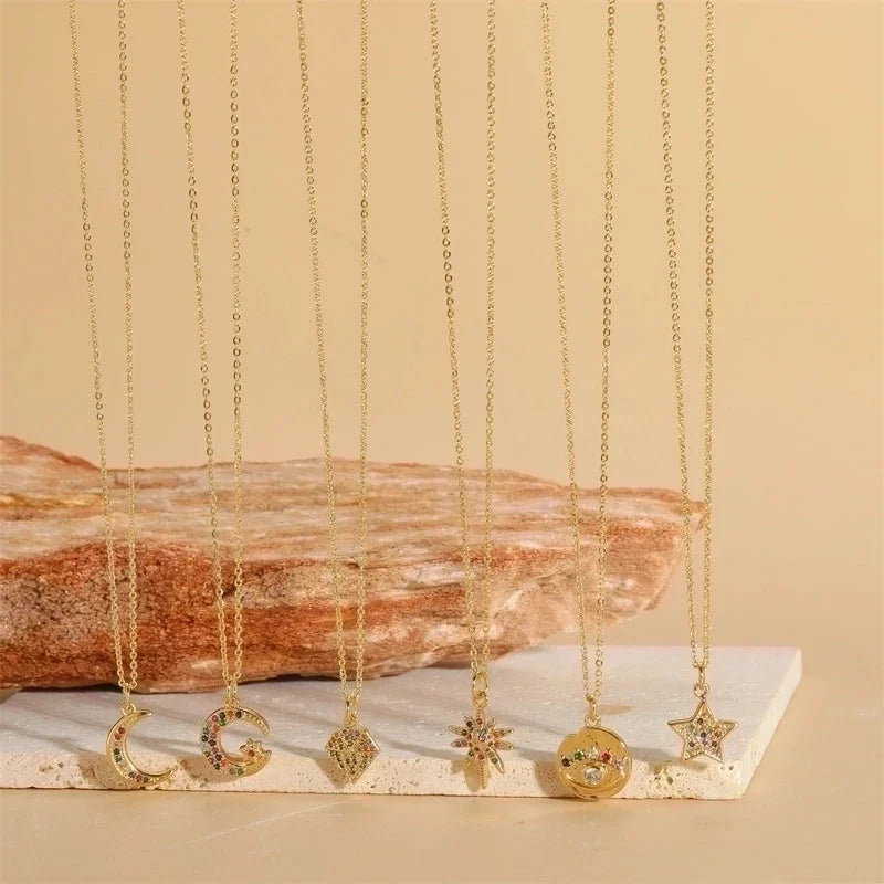 Copper 14K Gold Plated Vintage Style Minimalist Commute Inlay Star Moon Zircon Pendant Necklace