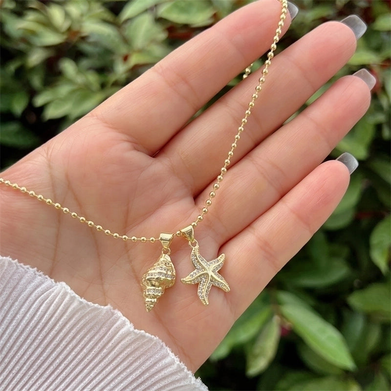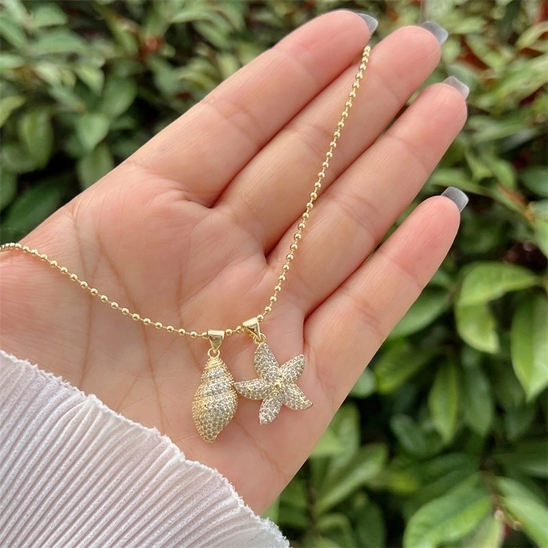 Copper Ball Chain 18K Gold Plated Inlay Scallop Conch Zircon Pendant Necklace