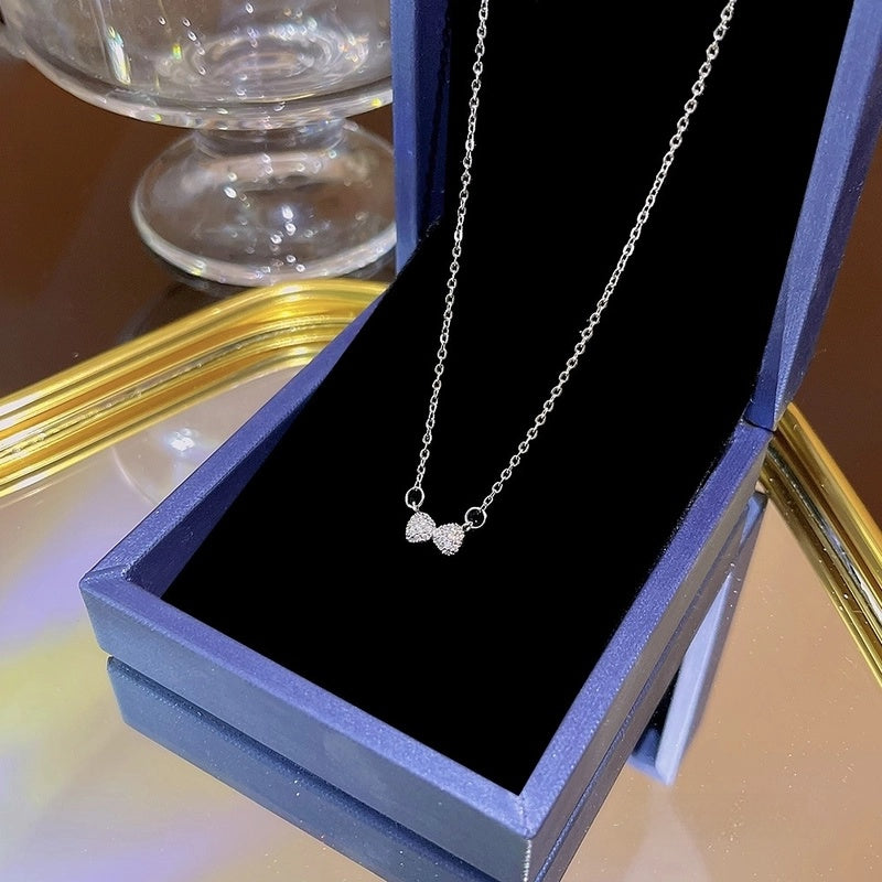 Elegant Classic Style Geometric Moon Bow Knot Titanium Steel Zircon Pendant Necklace