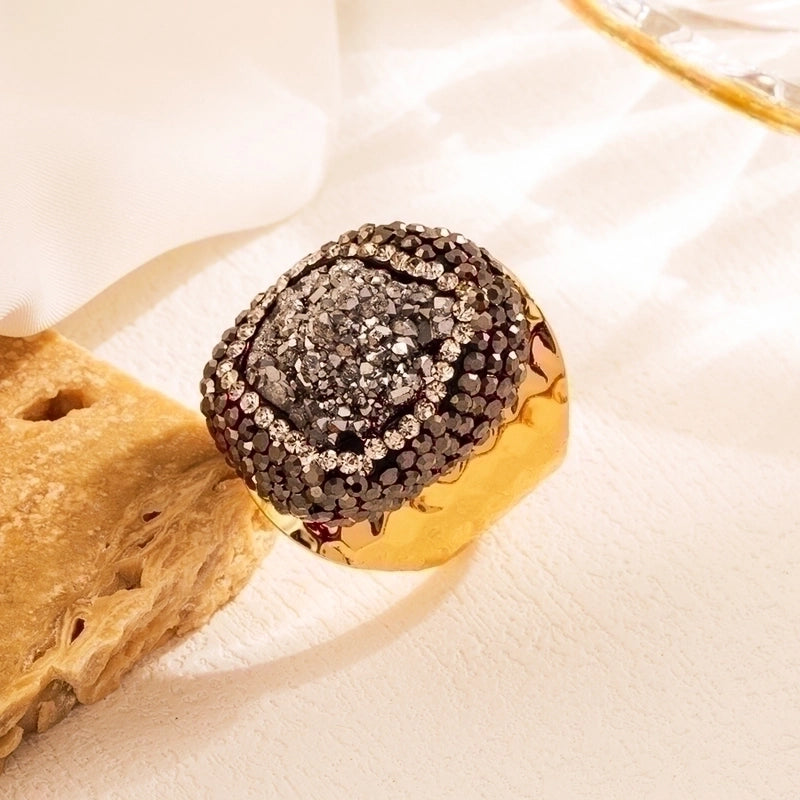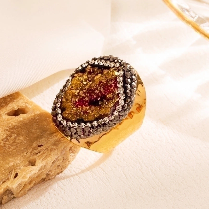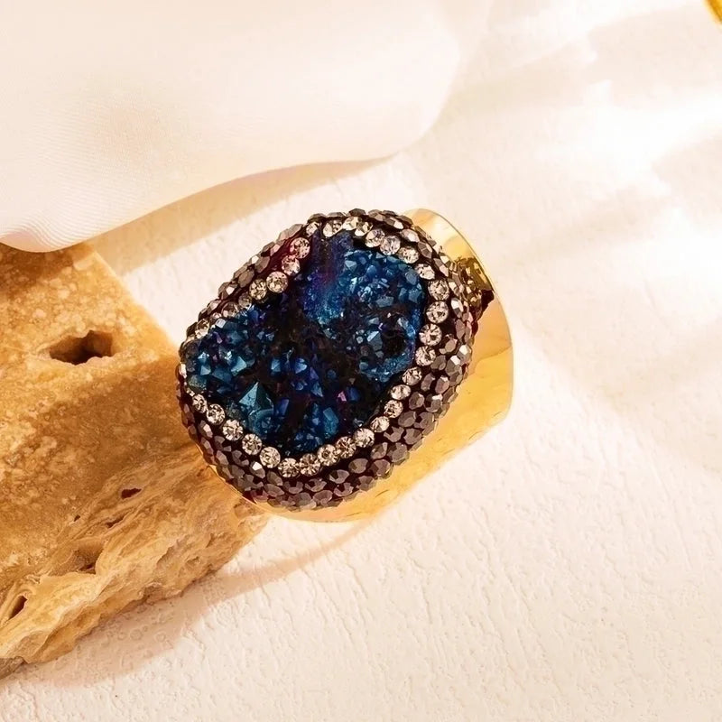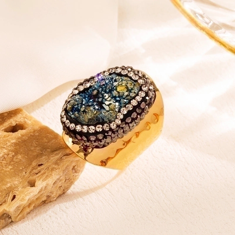 5 Pieces Elegant Retro Irregular Copper Plating Inlay Natural Stone Gold Plated Wide Band Ring