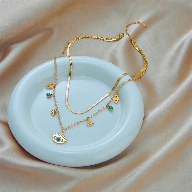 Fashion Sun Eye Titanium Steel Plating Inlay Turquoise Layered Necklaces