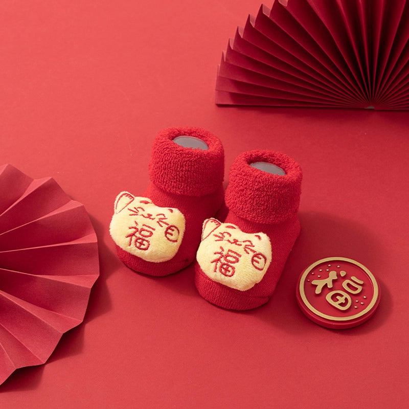 New Newborn Baby Socks Autumn And Winter A Cotton Red Terry Fleece-lined Thickened Non-slip Baby Christmas Floor Socks 1