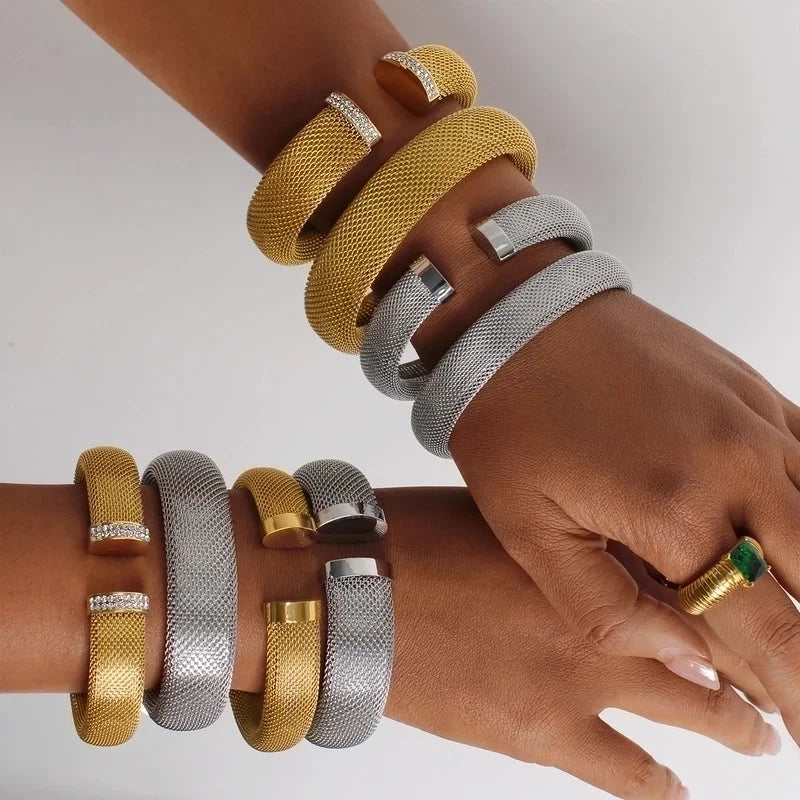 Retro Classic Style C Shape 304 Stainless Steel 18K Gold Plated Rhinestones Bangle In Bulk