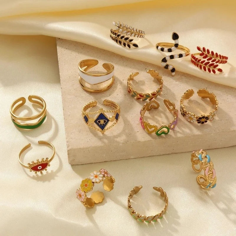 Retro Eye Flower Snake 304 Stainless Steel 18K Gold Plated Enamel Open Rings