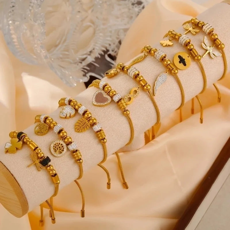 Retro Minimalist British Style Round Heart Shape Life Tree 304 Stainless Steel 18K Gold Plated Rhinestones Bracelets In Bulk