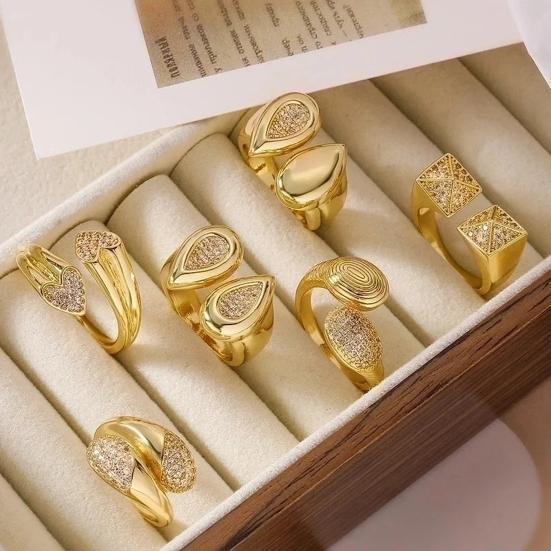 Retro Minimalist Commute Water Droplets Heart Shape Copper Inlay 18K Gold Plated Zircon Open Rings