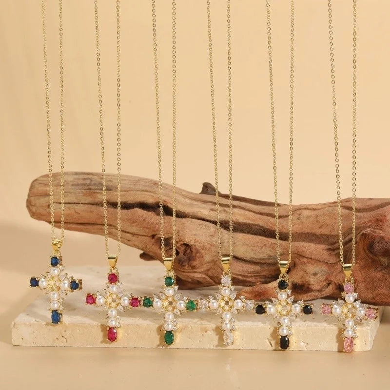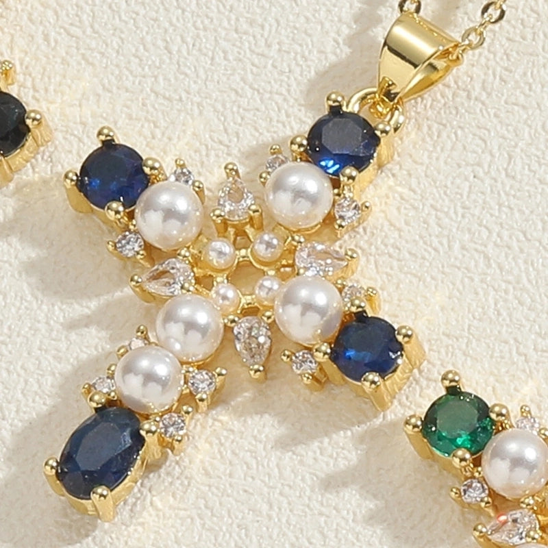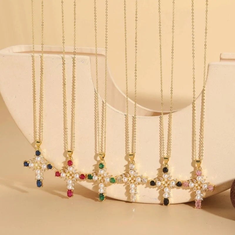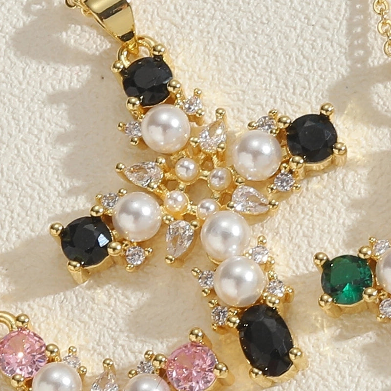 Sweet Cross Copper Plating Inlay Zircon 14k Gold Plated Pendant Necklace