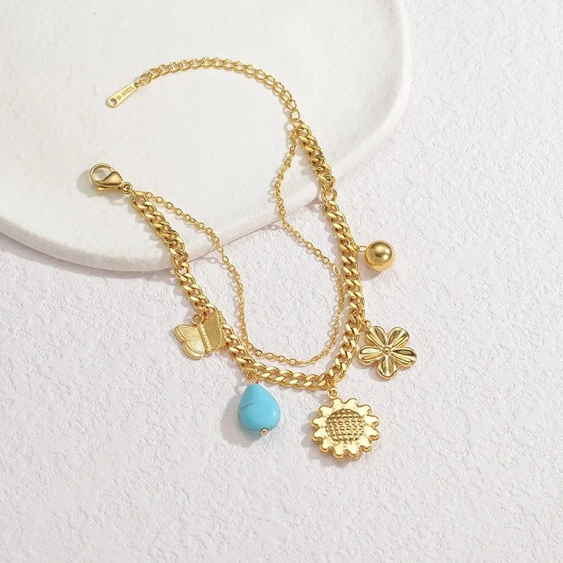 Sweet Minimalist Heart Shape Flower Butterfly 304 Stainless Steel 18K Gold Plated Figaro Chain Multi Charms Bracelet Bracelets In Bulk