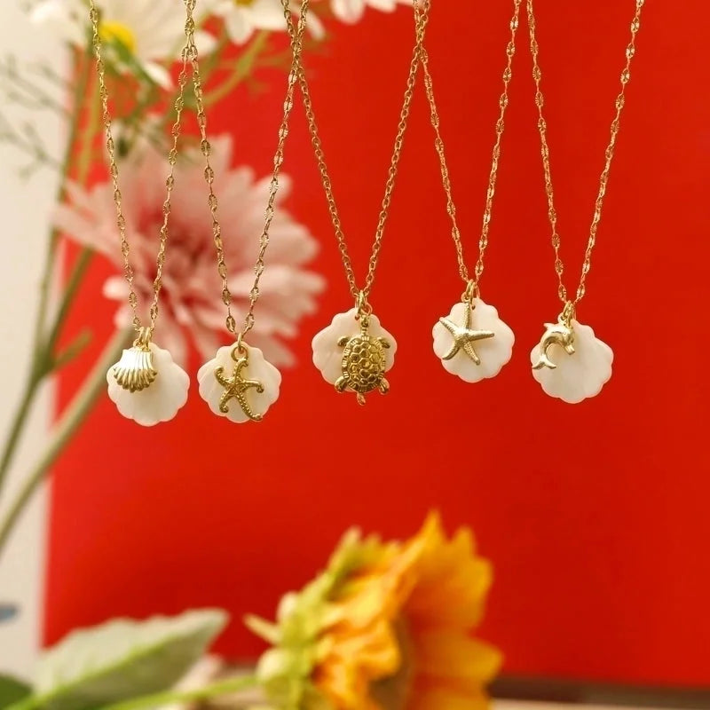 Vacation Marine Style Beach Starfish Dolphin Shell 304 Stainless Steel Shell 18K Gold Plated Pendant Necklace